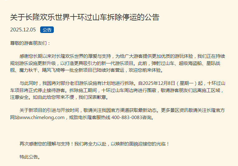 长隆喜悦天下12月5日发布公告,自2025年12月8日(星期一)起,十环过山车技俩将庄重罢手理睬旅客。捣毁施工期间,十环过山车相近将进行围蔽。同期,弹射过山车、超等海盗船、星际战船、魅力秋千、飓风飞椅等一批全新技俩已链接对客营运。以下为见知原文:
